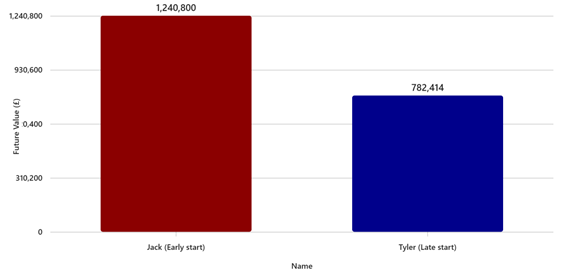Both could potentially grow to over £1 million in today’s purchasing power. From the 6 April 2027, the beneficiaries of these sizable pensions are likely to be affected by Inheritance Tax on unused pension funds and death benefits*. Despite contributing £115,200 less overall, Jack ends up with more than £458,385 in his pension pot than Tyler.
