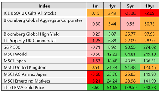 • In £ terms, Asia Pacific (ex Japan) markets suffered some of the worst losses at -3.66%, as AI profit-taking accelerated, while Europe stayed flat at 0.10% in sterling terms.
